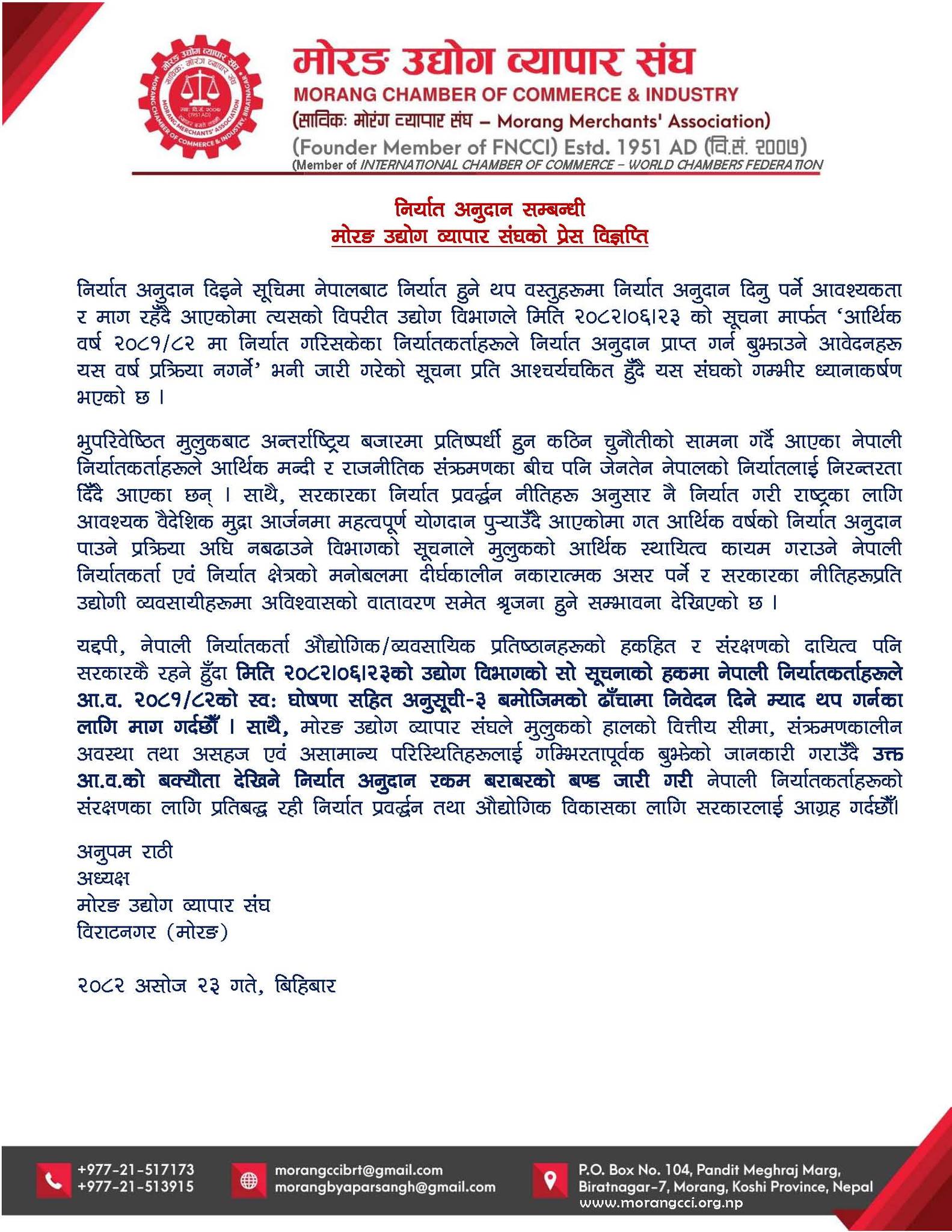 मिति २०८२ असोज ८ गते, बुधबार, मोरङ उद्योग व्यापार संघले संघीय अर्थ मन्त्री रामेश्वर प्रसाद खनाललाई संघमा स्वागत गरी भेटघाट तथा छलफल गरेको छ ।